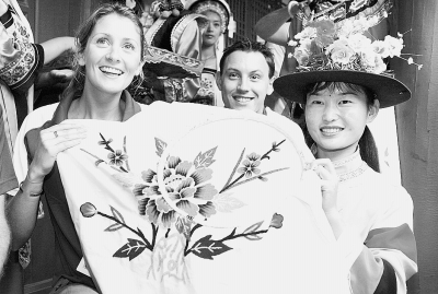 国外友人体验中国文化绣出传统牡丹花 CFP