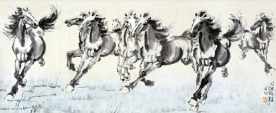 徐悲鸿是中国当代杰出画家,他画马堪称一绝,早也是以画马闻名。他长期观察研究马的肌肉、骨骼以及神情动态,经常在山乡和有马的地方对着真马写生,画马的速写稿不下千幅,所以下笔时能做到 “全马在胸”,笔墨酣畅。早年流落上海时,他曾画了一幅马寄给上海美术馆,主持该馆的岭南派画家高剑文兄弟观之赞赏:“虽古之韩干,无以过也。”