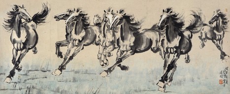 徐悲鸿曾在1940的一幅群马图上题款日:“昔有狂人为诗云,一得从千虑,狂愚辄自夸,以为真不恶,古人莫之加。悲鸿时客西马拉雅山之大吉岭”。由此,在徐悲鸿的笔下,一匹匹骏马奋踪扬蹄,在广袤的土地上飞奔,有的腾空起飞,有的蹄下生烟。有的回首顾盼,有的一往直前,都给人破纸而出的感觉。
