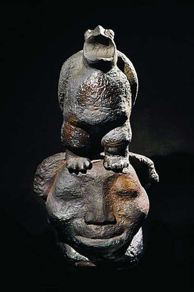 艺术家对于生活的周围环境,人和事总是有着与生俱来的敏感,比如说现代人生活的焦虑、浮躁感。他说,这种感觉笼罩着每个人,包裹着大众,无人幸免,大家都在困扰,都在希望能突破,希望有宣泄的途径。而这给了自己创作的灵感,尤其是给了他自身艺术风格打造的新的启发,并在近年来形成了一种“人、动物”(见图)搭配构成的雕塑作品特色。用他的话说,新创作的作品都有一种“格式”,即一个大大的人头和延伸的事物进行搭配,延伸的事物则以各种动物为主。比如说他的新作《远古的回声》,一个大大的人头,表情淡然,显出“冥思”状,而人头上的乌龟则开口长鸣,充满岁月感,“乌龟代表了岁月长远,而人的表情,则代表与远古的某种心灵契合,这恰恰是现代人在烦扰之余需要自我反省,找回自我的方式,是一种人生的体验和警示。”