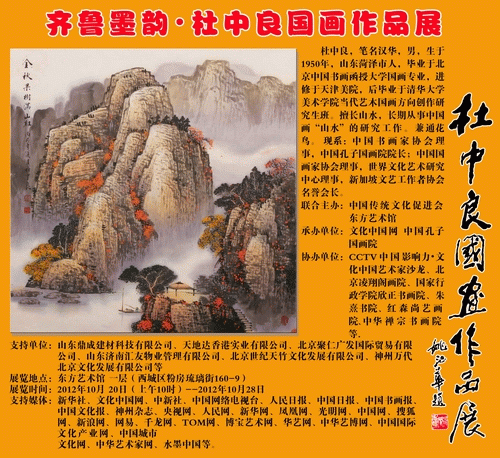 2012年10月20日上午,“齐鲁墨韵•杜中良国画作品展”在北京东方艺术馆隆重开幕,原周总理秘书、中国任礼宾官员、周恩来纪念馆馆长、书画家古今明,中国传统文化促进会会长杨丽丽,解放军艺术学院政委谭友鹏,央视《寻宝》鉴定专家、林散之大师弟子、书法名家王敬之,中国书协会员、中国将军诗书画院副院长李建国将军,东方艺术馆馆长、凌翔阁画院院长张永祥,中国书画家练联谊会玉泉书画院院长程志强,中国传统文化研究会执行会长那国宏,安全局安全监察司司长杨庆生,中国传统文化促进会名誉会长詹国太,北京书画研究会秘书长、书法家刘京生等嘉宾,以及企业家、艺术家百余人参加了开幕式。