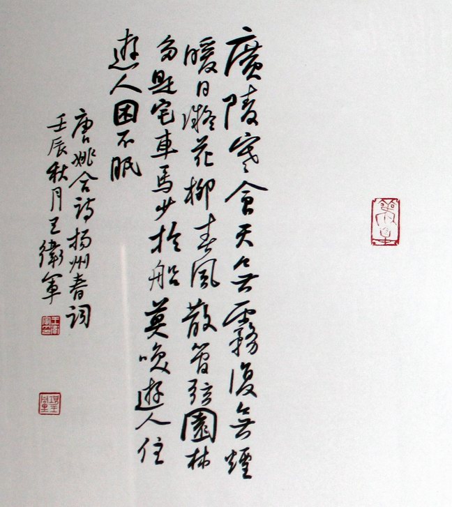 11月26日,由南京元真艺术馆主办的“王卫军书法精品收藏展”在朝天宫古玩市场展出,本次王卫军书法藏品展是元真艺术馆推出的馆藏名家书画精品展系列之一,精选了书法家王卫军近期创作的30多幅精品力作,有典雅精致书札小品,也有洒脱俊逸六尺巨幅,作品充分展示书家深厚的传统功底和个性追求的完美统一,并且巧妙地将文字主体、印章、留白及书写载体的颜色糅合在一起,产生了独特的艺术效果和全新的审美感受。他的行书,给人文质彬彬、用笔婉丽、秀逸蕴藉、格调高雅的感受。展览至12月10日结束。