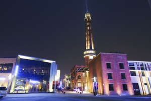 4月17日上午,记者在西水东地区看到,在西水关桥南侧有一间空闲的老厂房,厂房西北面竖着一只高30多米的烟囱,烟囱看上去已十分陈旧,老厂房已被一片幕墙围挡,保护了起来。另一根老烟囱已经得到了保护与修复,在夜间霓虹灯的照耀下,这根老烟囱显得十分漂亮。