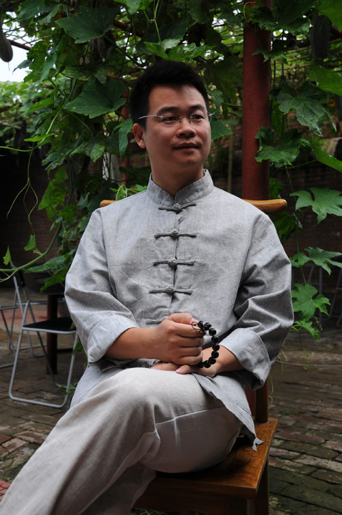 在谈到意象写实风格和佛家道家思想在画作上的具体表现的时候,方宋先生给我们讲解了他非常满意的作品《有榕图》。这幅图主要是通过榕树的刻画来表达中心思想的。“你仔细看这幅图,会发现这棵榕树历经沧桑而巍峨不动,非常有气势。而且它的根是长在流动的水潭里的一块土当中的,可以看出它的生命力是非常的顽强。所以当你做到能包容万物的时候它才能容下你。既能容树又能容大体。它斑驳的树根、繁茂的枝叶,展示了其旺盛的生命力。整个画面看似很复杂,但其实是很简单的,是水、石头和树。世间万物其实也是很简单的,像这幅图一样,很简单的组合,但看起来什么都有了,旺盛的生命力、岁月斑驳的痕迹、包容天下的胸怀等等,很完美。”