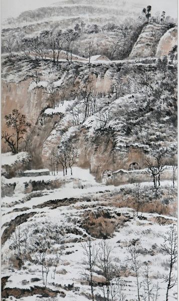 众所周知,用中国传统技法画雪景是有局限的,然而祁自强在长期的创作中,把传统国画与西方绘画相结合,既有泼墨信笔的洒脱,也有丝丝入扣、纤毫毕现的笔触,通过浓淡相宜、疏密有致的笔触,把雪的“白”从黄土、苍松中“逼”将出来,令人拍案叫绝。