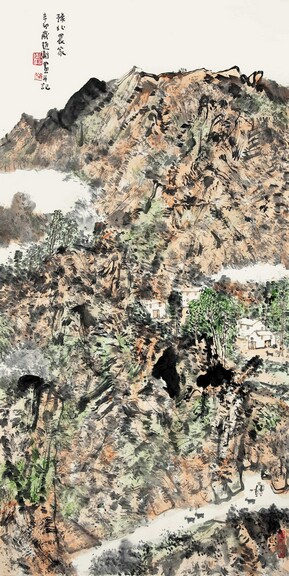 苍茫孤峻的山石,或泛黄,或泛青,或泛白,或黄绿各色相间,色彩始终在变,随着季节,随着心境;山离不开树,树在赵卫的笔下是很符号化的,但也是变化多端的,树令山显得更有层次,令整个画面更富有节奏感;看似随意点缀其中的几栋简单农舍,带点神秘,远离世俗喧嚣,却是画家精心布局的棋子,且给读画者留下了足够的想象空间,令人情不自禁地猜测那里的风土人情,那里不为人知的故事;水是离不了的风景,或如白练从天而降,或如玉带蜿蜒曲折,滋润着山石,滋润着树木,滋润着人心;略显夸张的人物造型,几笔勾勒的农家动物,使得农家的野趣和生活化的情景跃然纸上。线条的刚健,皴擦的柔美,彼此独立而又不可分割,刚健只有与柔美结合才能成为阳,柔美只有在刚健的对比下才能彰显其魅力。