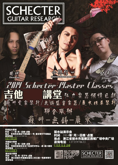 Schecter guitar research &Holidaymusic 弘力乐器联合推出Schecter吉他大师讲堂三人之旅,此次Schecter吉他工厂和弘力乐器大力邀请到中日三位SCHECTER吉他代言人--日本电吉他演奏家、教育家、地狱吉他教程作者小林信一先生;极具天赋的音乐人、吉他讲师、瘦人乐队吉他手周坤先生;中国新晋电吉他演奏家、中国潜质的新一代青年吉他演奏家、音乐人、空中狂欢节乐队创始人纪元老师共同促成了此次Schecter大师课讲堂的举办,2014年授课荣誉进驻弘力乐器的合作伙伴苏州爱乐琴行、无锡盛音乐器与丽水豚草琴行,感谢以上三家极具实力的经销商热情承办。