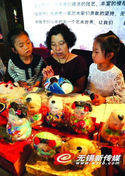 国庆假期,“记录孩子的成长——2014年大型少儿艺术展”在北仓门艺术中心举行。图为小朋友在工艺美术师过伟琦指导下学习给泥塑作品上色。宦玮/摄