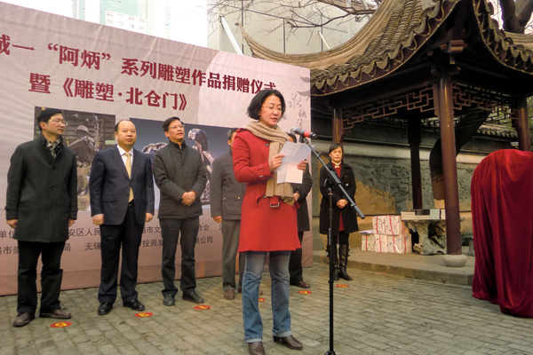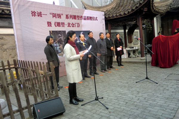 2月12日上午八点,由崇安区人民政府,无锡市文学艺术联合会、江南大学设计学院联合举办的“徐诚一‘阿炳’系列雕塑作品捐赠仪式暨《雕塑·北仓门》式”在无锡崇安区阿炳故居举行。市委常委、宣传部部长王国中、江南大学党委副书记周小浦、崇安区委书记刘亚民、市文联党组书记、主席刘基平等领导参加活动,并为捐赠的雕塑作品揭幕。