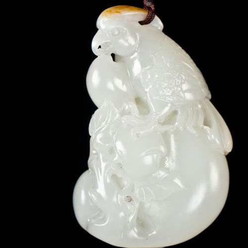 此款玉雕玉质温润缜密,光泽明亮纯净。玉雕师立体圆雕,矗立的鹦鹉,口衔着柿子。鹦鹉造型逼真写实,精雕细琢勾勒出羽翼精致丰满的造型,鹦鹉嘴喙坚韧,双眼英武,钢爪雄壮。同时巧妙地将枣红皮俏色成鹦鹉翎毛之姿,娇艳多姿,画龙点睛之效。  丰润饱满的柿子“柿”与“世”谐音的手法,与鹦鹉相组合,“鹦鹉”如同“英武”,组合成了“一世英武,正大光明”的吉祥美意。此款玉雕精美无比,寓意吉祥,值得拥有。
