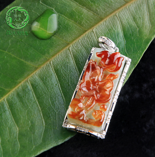 作品寓意:整幅作品采用俏色巧雕工艺,突出了翡翠之特性。翡象征火,五行中火曰炎上,有生发、积极向上之意;莲象征水,五行中水曰润下,有内敛、温润向下之意。作品中的红莲,寓指君子既有水一般谦虚卑躬之心,亦有火一般积极向上的精神。水火兼容,阴阳平衡,谓万物之规律,谓君子之道。