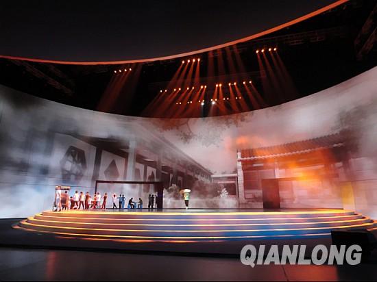 昨晚,走进体育馆,记者看到的是一块子上写着的醒目大字:“2012大型情景音舞诗画《天安门》距2012年5月16日开幕9天”。此时的体育馆内搭建成气势恢宏的巨大圆形舞台,舞台中间双向时空转盘,多层360度旋转为演员提供了灵活的表演空间,空中特殊装置让演员从天而降。宽60米、高20米的180度环型LED大屏幕,具有强烈的视觉冲击力。在LED屏上有一个出人意料的长达11米的旋转摇臂随时出现。此外,LED屏还隐藏着几处伸缩台阶,可以随时伸展。一架A380空中客车“降落”在体育馆舞台上时,在LED屏上竟神奇地出现了悬梯,有真人从LED屏中走出,让记者惊叹不已。