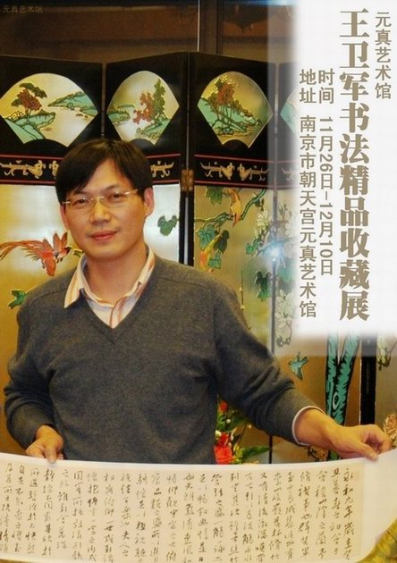 11月26日,由南京元真艺术馆主办的“王卫军书法精品收藏展”在朝天宫古玩市场展出,本次王卫军书法藏品展是元真艺术馆推出的馆藏名家书画精品展系列之一,精选了书法家王卫军近期创作的30多幅精品力作,有典雅精致书札小品,也有洒脱俊逸六尺巨幅,作品充分展示书家深厚的传统功底和个性追求的完美统一,并且巧妙地将文字主体、印章、留白及书写载体的颜色糅合在一起,产生了独特的艺术效果和全新的审美感受。他的行书,给人文质彬彬、用笔婉丽、秀逸蕴藉、格调高雅的感受。展览至12月10日结束。