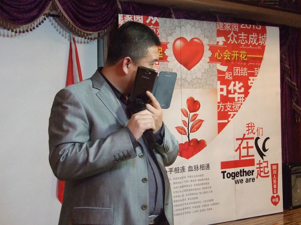 孟泓安秘书长正与身在雅安地震现场的仁爱慈善基金会的负责人连线,在连线中确定所要的物品!