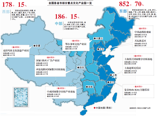 中国文化创意产业网4月21日统计显示,目前已建文化创意产业园区共计1216个,园区分布于东、中、西部地区。