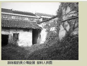 “故居大约一周前被拆的。”贾扬回忆说,吴介璋故居在阳山镇新西自然村并不出名,但村里部分老人知道这栋老房子的主人颇有来头。