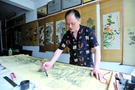 非物质文化遗产传承人牟秉衡正在竹帘上作画记者张路桥摄