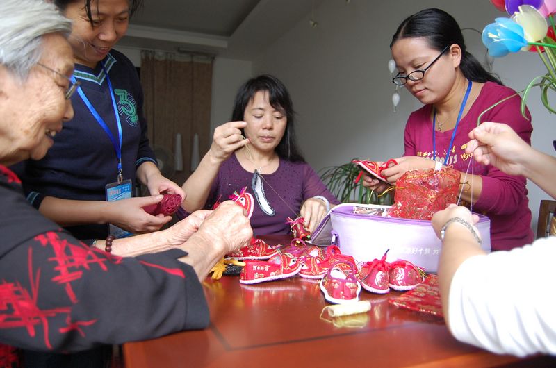日前,几位年轻社工来到塔影苑社区87岁的许阿婆家,跟许阿婆学习虎头鞋的制作方法。在她指导下,大家利用糖果袋、塑料袋和废弃的布头,制作出了一双双可爱的小虎头鞋。许阿婆经常将亲手制作的虎头鞋送给小朋友,她表示很愿意把这门手艺教给年轻人,让更多的小朋友能穿上漂亮环保的虎头鞋。