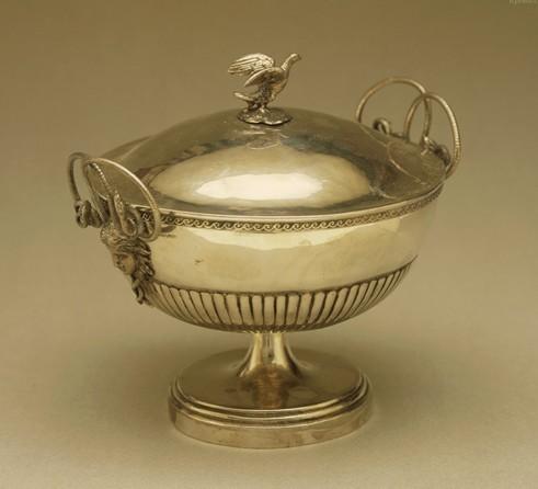 装饰有美杜莎头像及蛇形把手的银质汤盘,银器,19世纪。