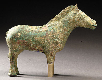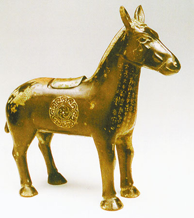 体姿英俊的良马,一贯深受国人的喜爱。古代用马驾车的历史颇为久远。在河南、陕西、山东等地殷商时期的遗存中,便出土有当时的双轮木马车和驾车的辕马,可惜只保存马骨架,难以看清原来的体貌。幸而在陕西甘泉发现有两件商代铸造的青铜马,使我们能看到商马的形貌——体矮颈粗,四肢较短而双耳颇大,外貌并不显神骏。西周和东周出土的青铜马,形体和甘泉商马相同,并都铸造成四肢伫立的呆板姿态,反映着先秦时期马匹形体特征。惟有从邯郸赵王陵被盗掘出的四匹铜马,呈迈步行走的姿态,似感生动。