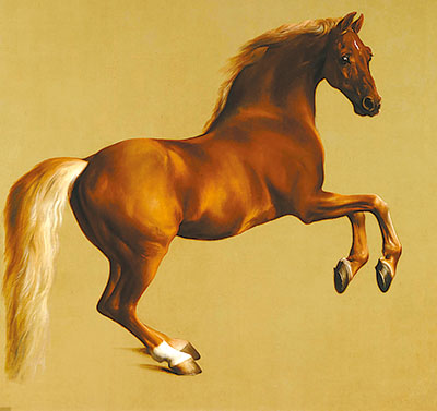 正如中国古代有曹霸、韩干、李公麟,近代有徐悲鸿以画马闻名,在西方美术史上也有很多艺术家对画马情有独钟,英国的乔治·斯塔布斯是其中之一。为了更好地表现马的结构和动态,斯塔布斯曾于1756年在林肯郡的乡村,在妻子的协助下解剖马匹,并于1766年出版了《马的解剖学》。事实上,在该书出版之前,他已经得到了大量来自英国贵族的委托,为他们饲养的骏马画像。斯塔布斯的作品要数油画《口哨外套》——口哨外套是马的名字,这匹体态优美的枣红马,两条前腿高高抬起,油亮的毛色像缎子般光滑。相比之下,中国艺术家更注重表现马的神韵,并不过分关注马的解剖结构。