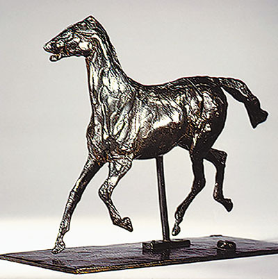 印象派画家德加也是同样爱马。他不仅在绘画中表现赛马,在他去世后,人们还在他工作室里发现了大量用蜡塑造的马的小稿。后来,小稿中保存比较完好的被翻制成青铜像,德加创作的马的雕塑才为更多人所知。《小跑的马》造型洗练概括,把马匹轻盈的步态生动地表现了出来。