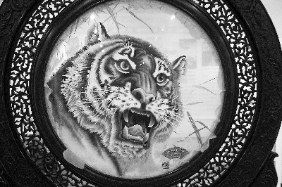 《狼头》,绣稿原作为美国画家,绣稿以超级写实手法,纤毫毕现刻画了素描色调的灰狼头。多变质感的毛路,使湘绣毛针的发挥极为淋漓尽致。这里,刺绣者综合运用了毛针、鬅毛针、游针,甚至创造性运用了绣孔雀的刀毛针,把狼头毛路质感的疏密、长短、虚实、软硬、卷曲、平直,一一表现出来,一针针,一线线,一根根,妥帖入肉,可堪抚摸,可堪扯拔。这也是针线经典的鬅毛针绣代表作。尽管《狼头》的刺绣者只是毕业于一年前的学生,但是在这幅作品中,绣稿的设计巧思和刺绣工艺绝技的效果达到了近乎完美的统一。