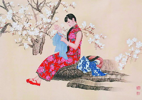 “日暮堂前花蕊娇,争拈小笔上床描。绣成安向春园里,引得黄莺下柳条。”描写的正是明媚的春日,一个轻灵秀美的古代女子坐在窗前,手中的针线灵活游走,爱恨情丝便栩栩如生地呈现在刺绣作品中。这样的场景本身便是一道风景。可惜现代女性平时忙于像男人般打拼,空闲时手指也忙于在屏幕来回,这种悠然刺绣的场景已很难见到。