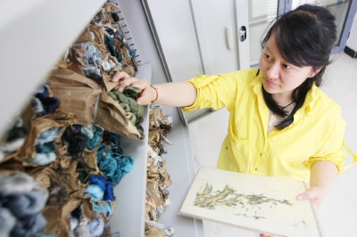 一幅刺绣作品需要上百种花色的线,黄奕彤正在对照画稿选线。