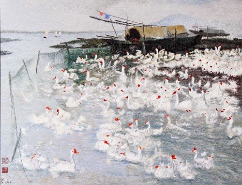 苏绣艺术一级工程师周海云,出生在苏绣之乡镇湖,苏州太湖边的水乡。这是一个水润的地方,水的灵气给了她苏绣艺术的悟性,她的绣品《太湖群鹅》采用虚实乱针绣,把西洋画的线条运用到刺绣上,使这幅中西结合的作品更加完美,它不仅代表了东方文明的艺术水平,也显示了刺绣的突变与进步。作品问世后,得到了业内专家的高度评价,在2007年首届东方工艺美术之都博览会上,获得了“迎春花奖”。