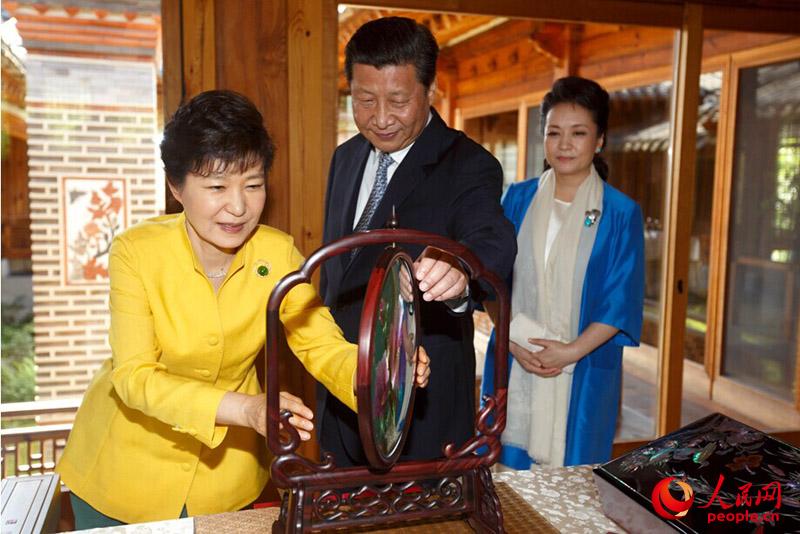 7月4日,主席习近平在访问韩国期间,向韩国总统朴槿惠赠送了用木槿花刺绣装饰的玻璃工艺品等礼物。其中,木槿花刺绣正是出自姚建萍之手。谈到这幅作品的创作灵感,姚建萍说道:“接到国礼定制任务后,我和我的团队马上投身到了创作中去。我们查到韩国的国花是木槿花,而韩国总统朴槿惠的名字中又有‘槿’字,所以我们立刻把主题定为木槿花。”习主席终将赠送的苏绣国礼名为《木槿花开》,为团绣形式,绣架由大叶紫檀木制成,整幅作品显得张弛有序,古色古香中透出现代时尚气息。