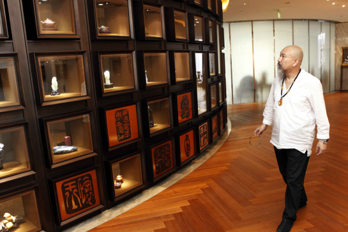 10月8日,吴德昇在展厅内浏览自己的部分创作精品。