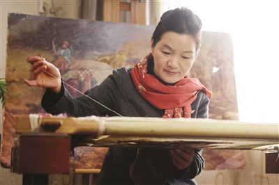 12月22日,走进位于苏州市高新区镇湖街道的姚建萍个人工作室内,这幅《丝绸之路——满载而归》的绣稿还挂在绣架上。姚建萍告诉记者,这幅作品以大唐盛世为基准点,着力表现胡商驼队在长安(今西安)采购完毕,满载货物翻越帕米尔高原的情景,体现了当时丝绸之路贸易的繁荣场景,是她《丝绸之路》系列作品中的一幅,花了三年的时间完成。在表现手法上,该作品是姚派“融针绣”的代表作之一,通过彩线的巧妙叠加来打造丰富斑斓的色调,仿佛用针线雕刻了时光,让悠久的历史画卷更加的鲜活而灵动起来。