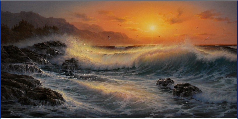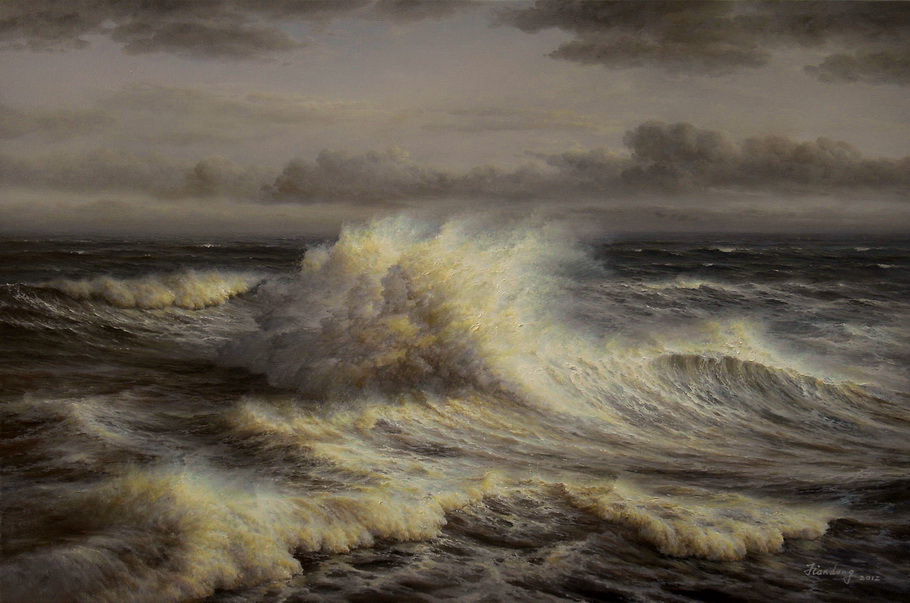他的海景技法纯熟,章法独特,作品中西结合,二十多年来专攻“海景”油画,受到国内外同行的好评。他的“海景”油画以海浪的气势,山石的唯美,达到天人合一的创作境界。在创意上独具精巧,赋予澎湃的海浪以气势与美感,将其升华到人类的情感,释放久困浮躁之心,折射对时代的赤子之情!他用写实和充满阳光的颜色去深层沟通,以丰富多彩的景象使人陶醉与迷恋,海的情怀演绎辉煌壮丽,形状气势的海浪形成激情的诗情画意。给观者以无限的美妙联想。