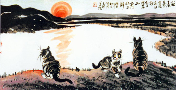 杨树文先生画动物,笔简而形不曲,虽是写意,但仍保持形象逼肖。他笔下的猫或蹲或伏,或立或行,或凝望,或观望,个个形象逼真可爱,如同再造,大有呼之欲出的感觉,使人观之不厌。《淘气的小猫》可称得上是一副匠心独运的佳作。许多人表现猫的淘气都首先考虑大动作,诸如玩线团、捞金鱼或给人添乱的一些动作情节。而他却采用了静态的表现形式,他把两三只稚态可掬、东张西望和迷茫不知所向的小猫,一字排开的安置在一个空旷的沙滩上,它们眼前是一片一望无际的苇淀。天边半轮下沉的红日。窄狭的天空位置是一排小诗横题,把天与苇淀混为一体,更增加了苇淀的辽阔和空旷感,使人不能不为这几只身临困境的小猫担心。读过款中小诗,你会更觉得此画的亲切好玩。诗云:“小猫真淘气,贪玩忘归期,红日坠西山,家门不知处。”有个朋友对我讲:“我家自从挂出了杨教授的《淘气的小猫》,孩子很少向外乱跑了。”