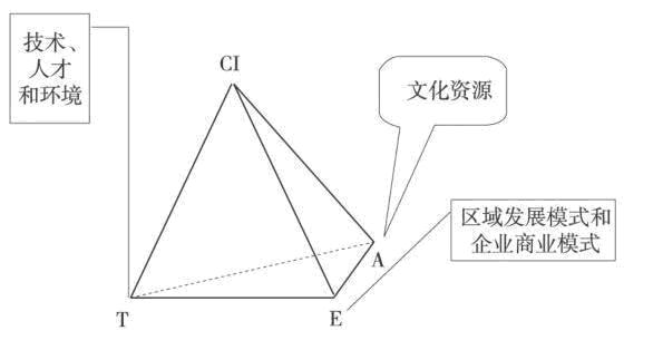 笔者曾提出用文化产业钻石要素 ( T EA) 模型来分析评估文化产业的生产力要素 。如图 1 , CI 指文化产业 ( Cultural Industries) , T 指 3 T ,包括了技术(Techno-logy) 、人才( Talents) 和宽容的政策环境( Tolerance) 三个方面 , E 指经济 ( Econo-mics) ,A 指艺术 (Arts) 。