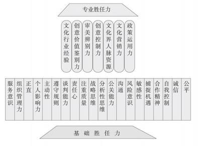 如图 ,这个双素质叠合模型包含的胜任力素质内容共有共27 项,分为基础胜任力和专业胜任力两层。其中,基础胜任力(20 项) :服务意识、组织管理能力、个人影响力、主动性、遵守规则、谈判能力、责任心、注重质量、战略思维、分析性思维、公关能力、沟通、风险意识、敏感性、捕捉机遇、正直、诚信、公平性、团队精神、自我控制;专业胜任力(7 项) :文化行业经验、创意价值鉴别力、审美辨别力、创意控制力、文化界人脉资源、文化营销力、政策运用力。这个模型符合我国文化产业发展初期创意经理人胜任
