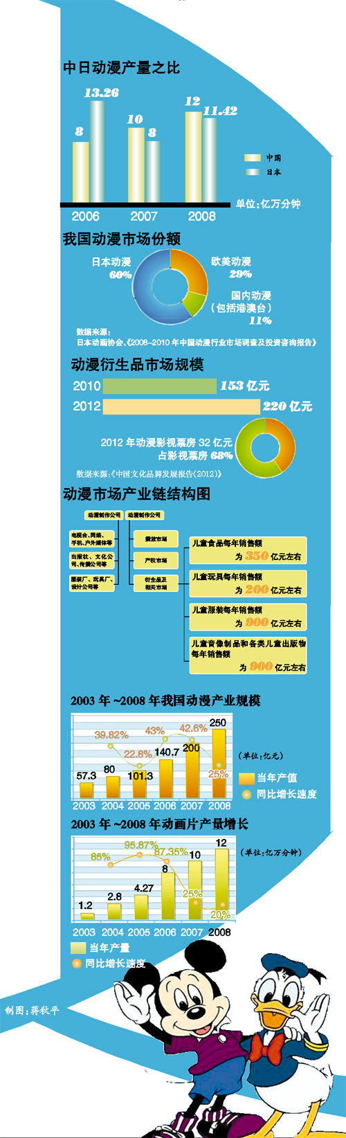 根据中投顾问发出的《中国文化品牌发展报告(2012)》,2012年我国制作完成的国产电视动画片共395部共计222938分钟,总量位居世界,然而目前国内动漫企业有85%处于亏损状态。
